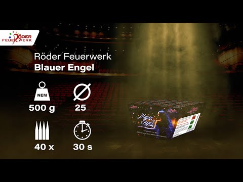 Der Blaue Engel von Röder Feuerwerk ist eine 40 Schuss Feuerwerksbatterie mit verschiedenen blauen Effekten: tiefblauer Kometenaufstieg zu tiefblauer Päonie mit orangen Dahliensternen, tiefblauer Kometenaufstieg zu tiefblauer Päonie mit golden Blinksternen, tiefblauer Kometenaufstieg zu tiefblauer Päonie mit türkisen Dahliensternen, tiefblauer Kometenaufstieg zu tiefblauer Päonie mit Goldweide mit Chrysanthemenspitzen.