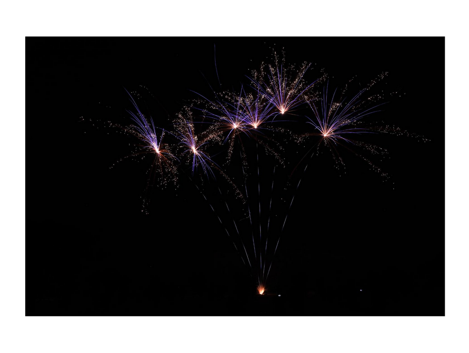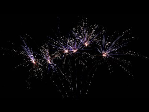Single Row, 6 Schuss nacheinander gefächert mit blauer Leuchtspur aufsteigend und anschließende Verwandlung zu goldenen Crackling-Kronen mit blauen Sternen.
