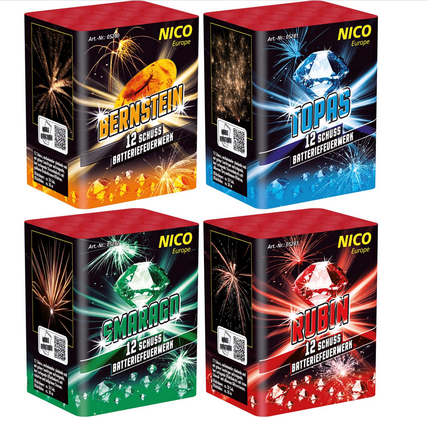 Rubin: 12 Schuss, nacheinander zündende und mit grüner Leuchtspur aufsteigende, laut zerlegende Effektbuketts mit roten Schweif- und silbernen Glitzersternen.