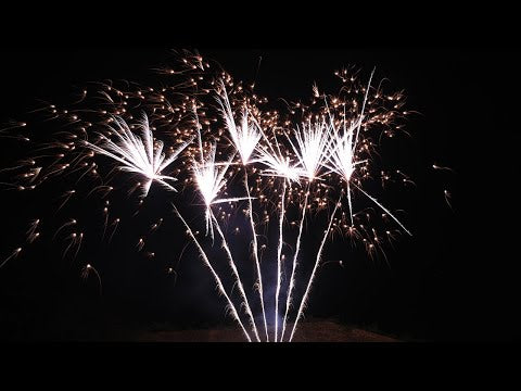 Single Row, 6 Schuss nacheinander gefächert mit silberner Leuchtspur aufsteigend mit anschließender Verwandlung zu Silber-Fächern mit gelben Winterblüten.
