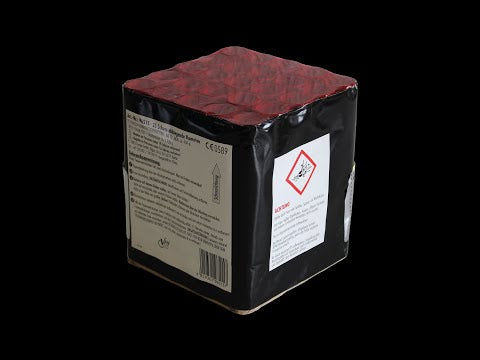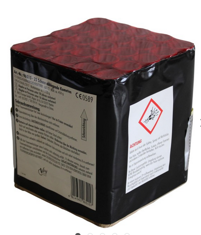 25 Schuss, in schneller Schussfolge nacheinander mit blauer Leuchtspur aufsteigend und anschließender Verwandlung in goldene "Swimming-Star" Effekte umrahmt von hellblaue Leuchtsternen.